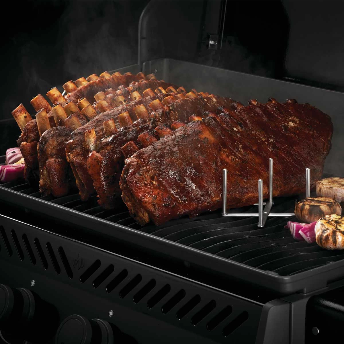 Clever und platzsparend: Der Napoleon Rippchenhalter ist perfekt geeignet, um bis zu 6 Spareribs auf wenig Fläche zuzubereiten. Im indirekten Bereich aufgestellt, garen die Ribs so rundum gleichmäßig und ausgesprochen zart. Der faltbare Rib-Halter lässt sich je nach Bedarf einstellen, um so viel oder so wenig Platz wie nötig auf Eurer heiß umkämpften Grillfläche einzunehmen.