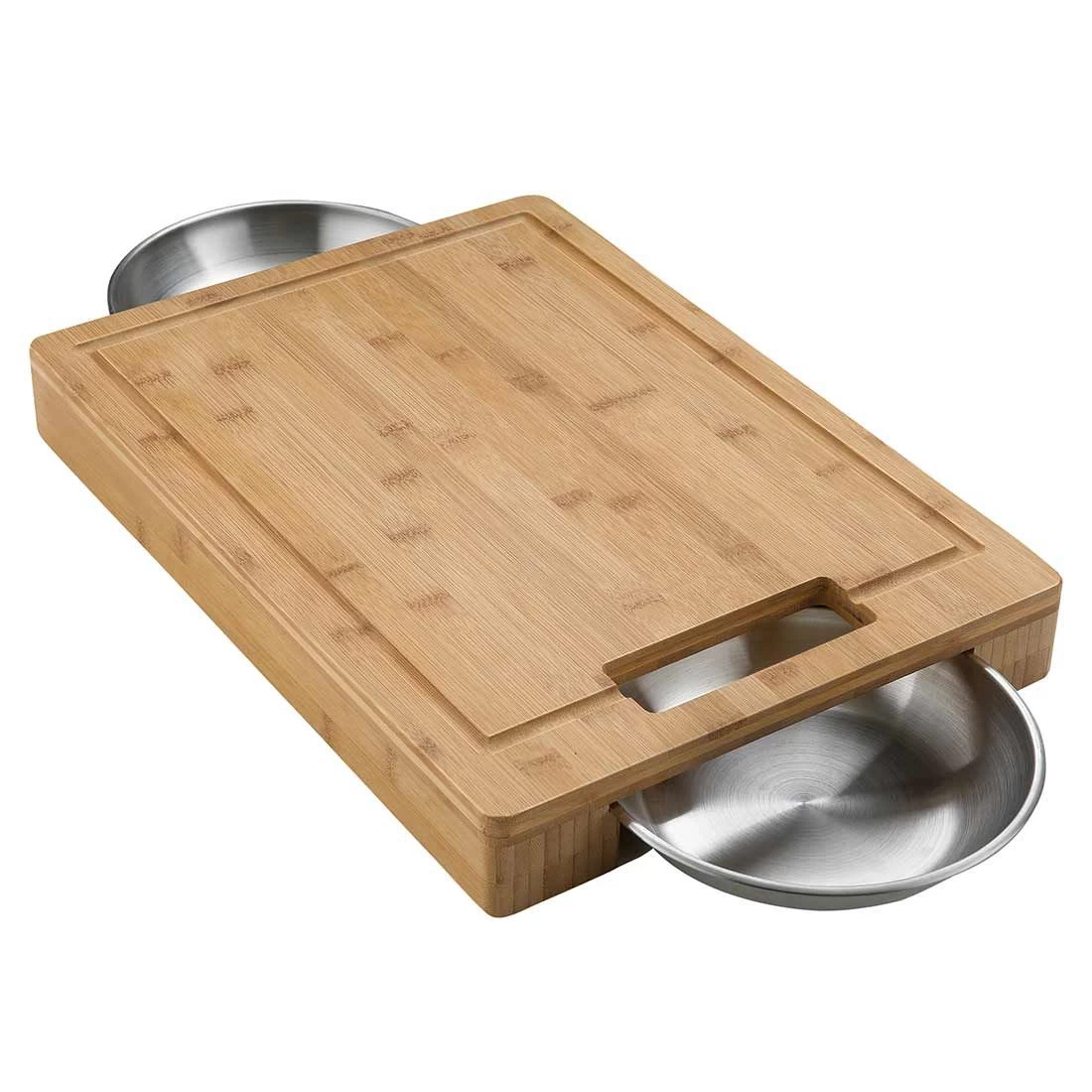 Hochwertiges Napoleon® Bambus-Schneidebrett mit 2 Edelstahlschalen zum Auffangen von Fleischsäften und Sichern von geschnittenem Gemüse (33 cm x 46 cm x 5,5 cm).