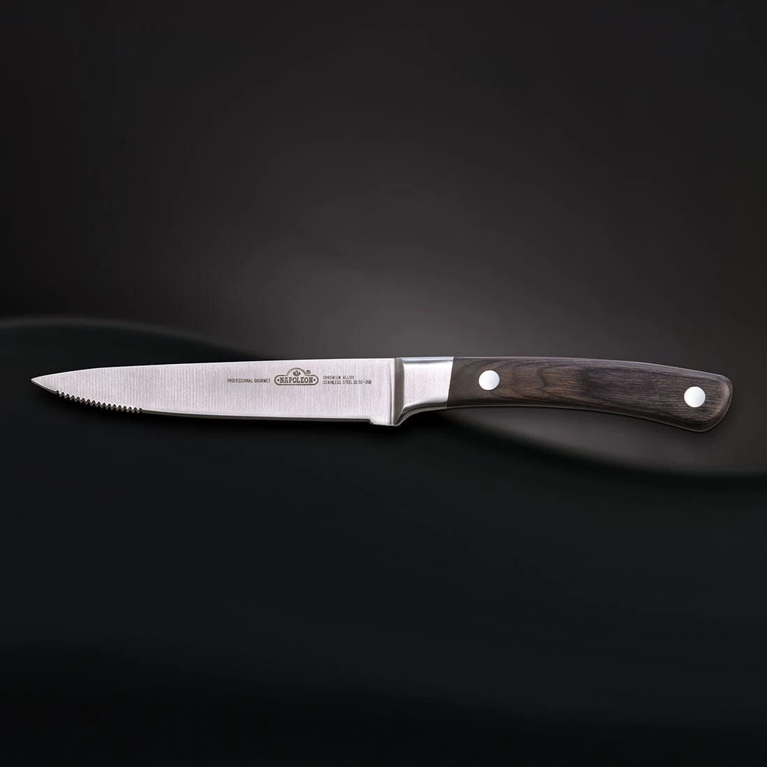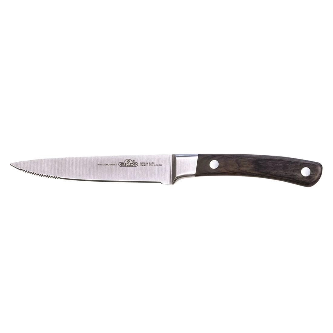 Das Napoleon® Steakmesser mit genietetem Rosenholzgriff gleitet mit seiner 12,7cm langen Klinge mühelos durch dicke Steaks. Das Messer ist robust geschmiedet sowie ideal ausbalanciert und besticht durch sein klares Design.